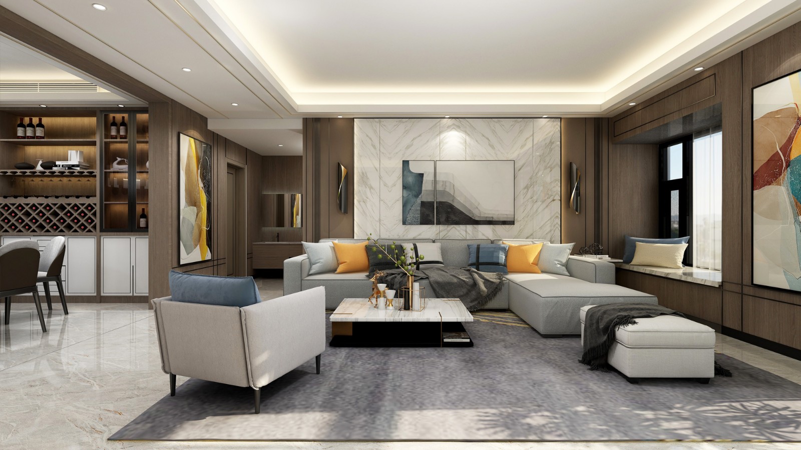 不管是沙發還是天花上的金屬條裝飾,都有非常硬朗的線條,讓整個空間都顯得十分立體。