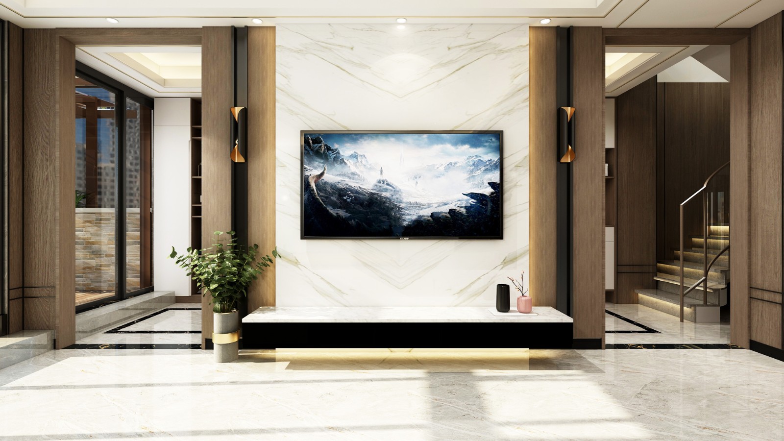 電視背景墻采用滿墻的大理石紋瓷磚,懸空的電視柜,高級感十足。
