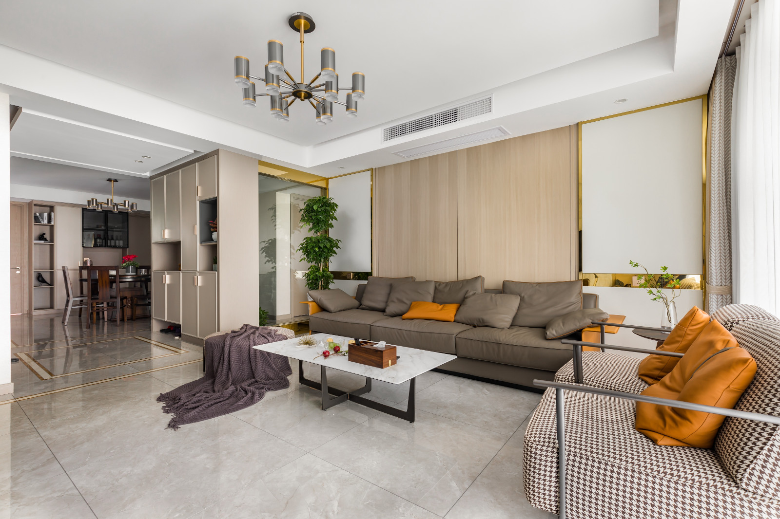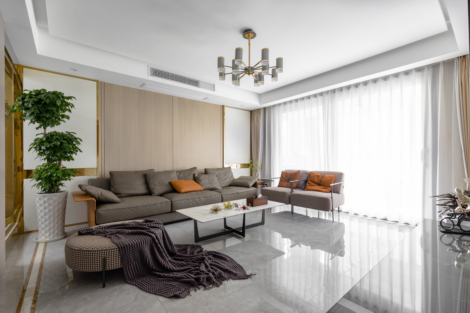 客廳戶型方正,整面木飾面板裝飾沙發背景墻,原木家具搭配米色布藝沙發,文藝淡雅。