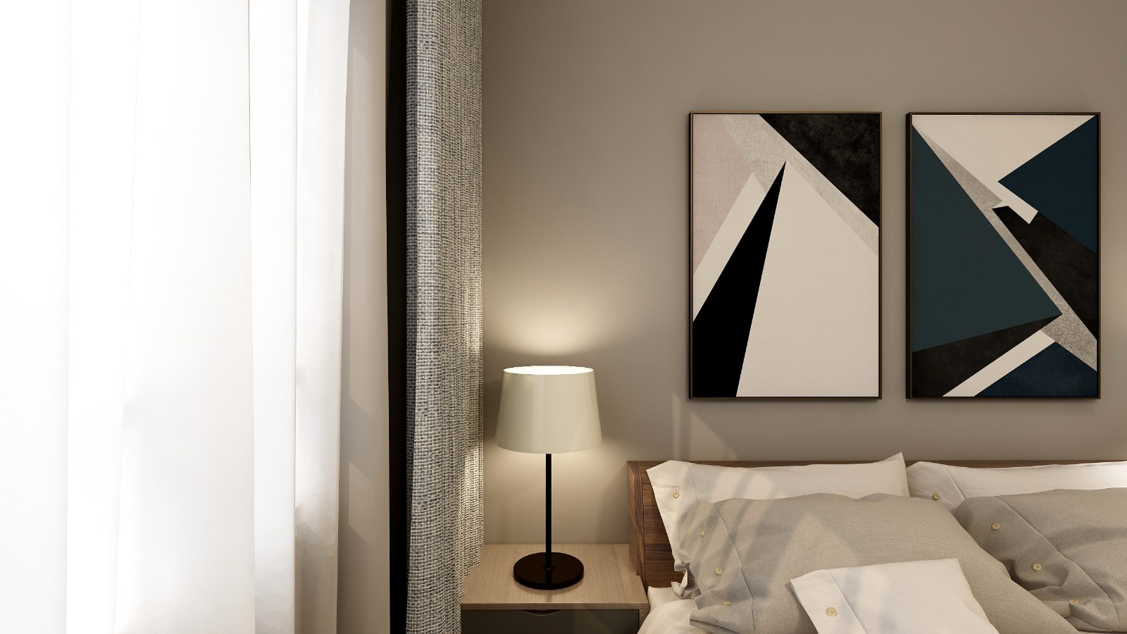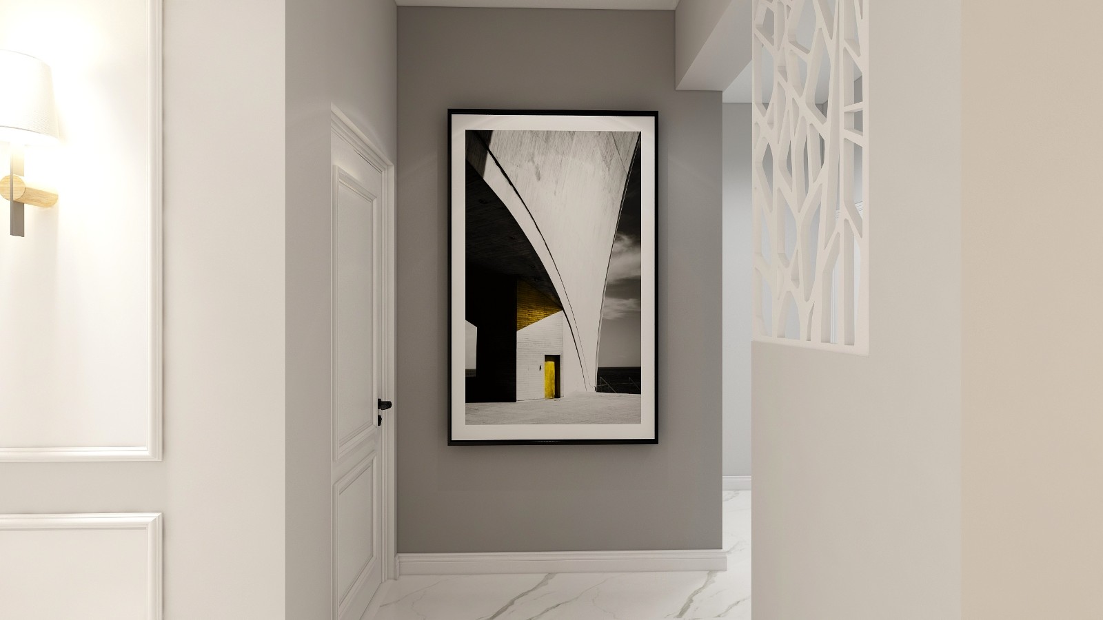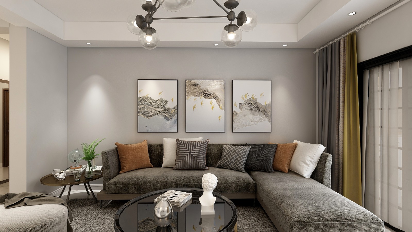 淺灰色的背景墻面漆,時尚動感的簡約風(fēng)掛畫,十分具有現(xiàn)代風(fēng)。一絲工業(yè)元素的棕灰色沙發(fā)搭配黑色的茶幾,深灰色加入一抹亮色黃,使空間的流行元素渲染出來。